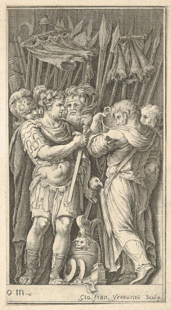 Soldiers, one shown frontally and holding a sword, at right a soldier with his back turned and holding a cup, four soldiers standing behind them with standards and spears, after the lost frescoes by Polidoro da Caravaggio on the facade of the Milesi Palace in Via della Maschera d'Oro, Rome