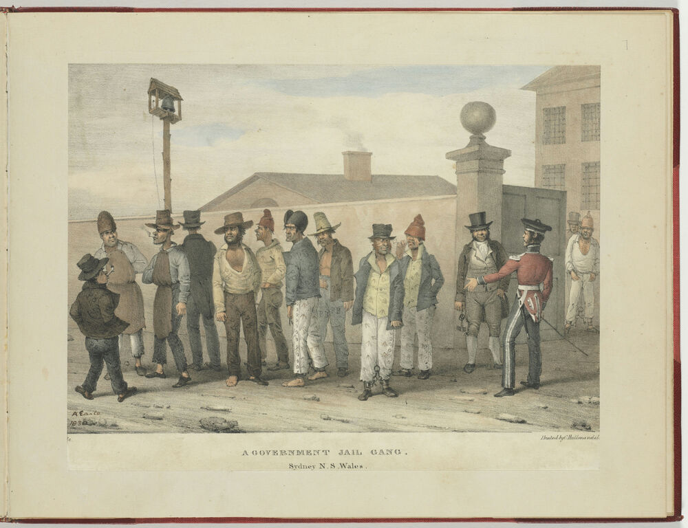 A Government Jail Gang, Sydney, NSW, ca. 1830, hand coloured engraving by Augustus Earle, Views in New South Wales and Van Diemens Land : Australian scrap book, London : J. Cross.