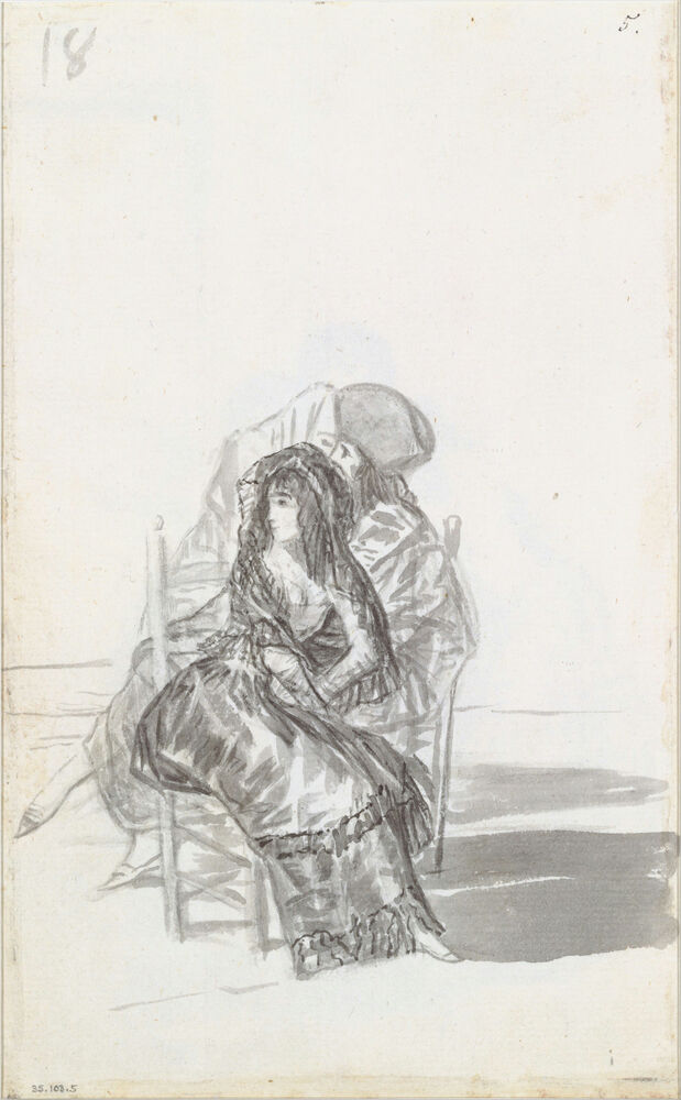 A maja seated on a chair with a male and female companion; folio 18 (verso) from the Madrid Album 'B'