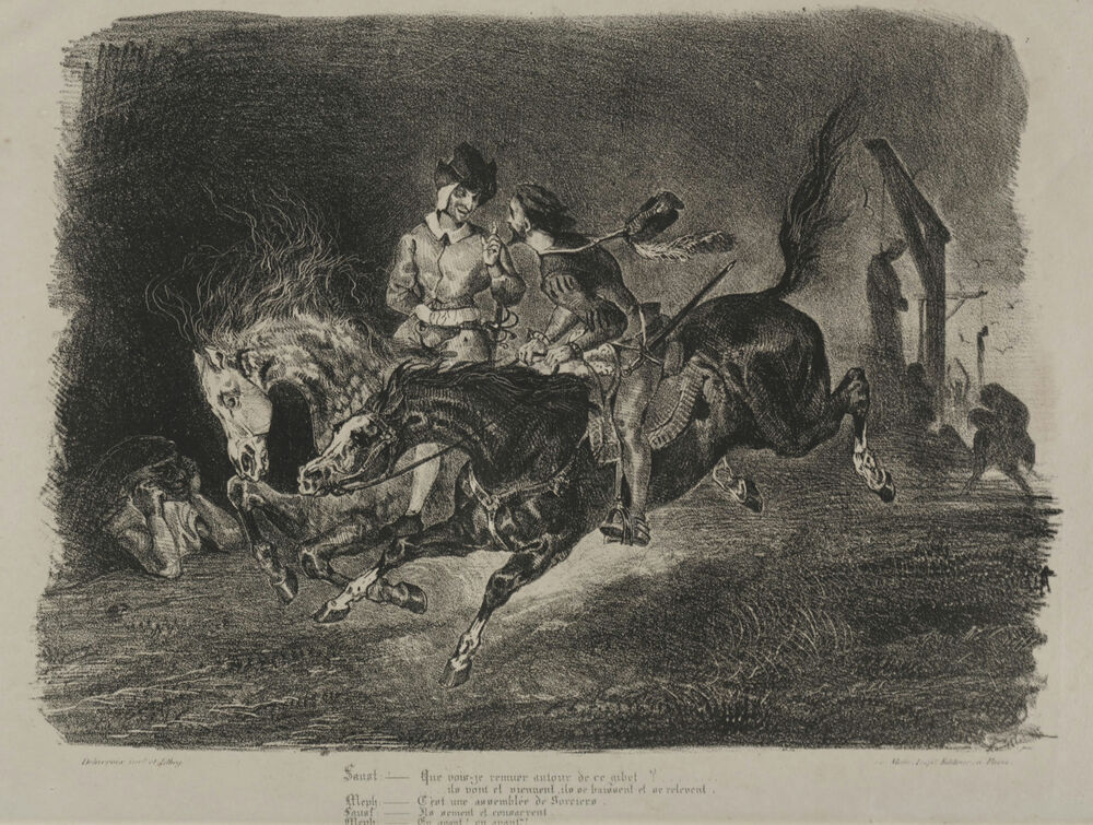 Illustrations for Faust: Faust and Méphistophélés horse riding on the Sabbath