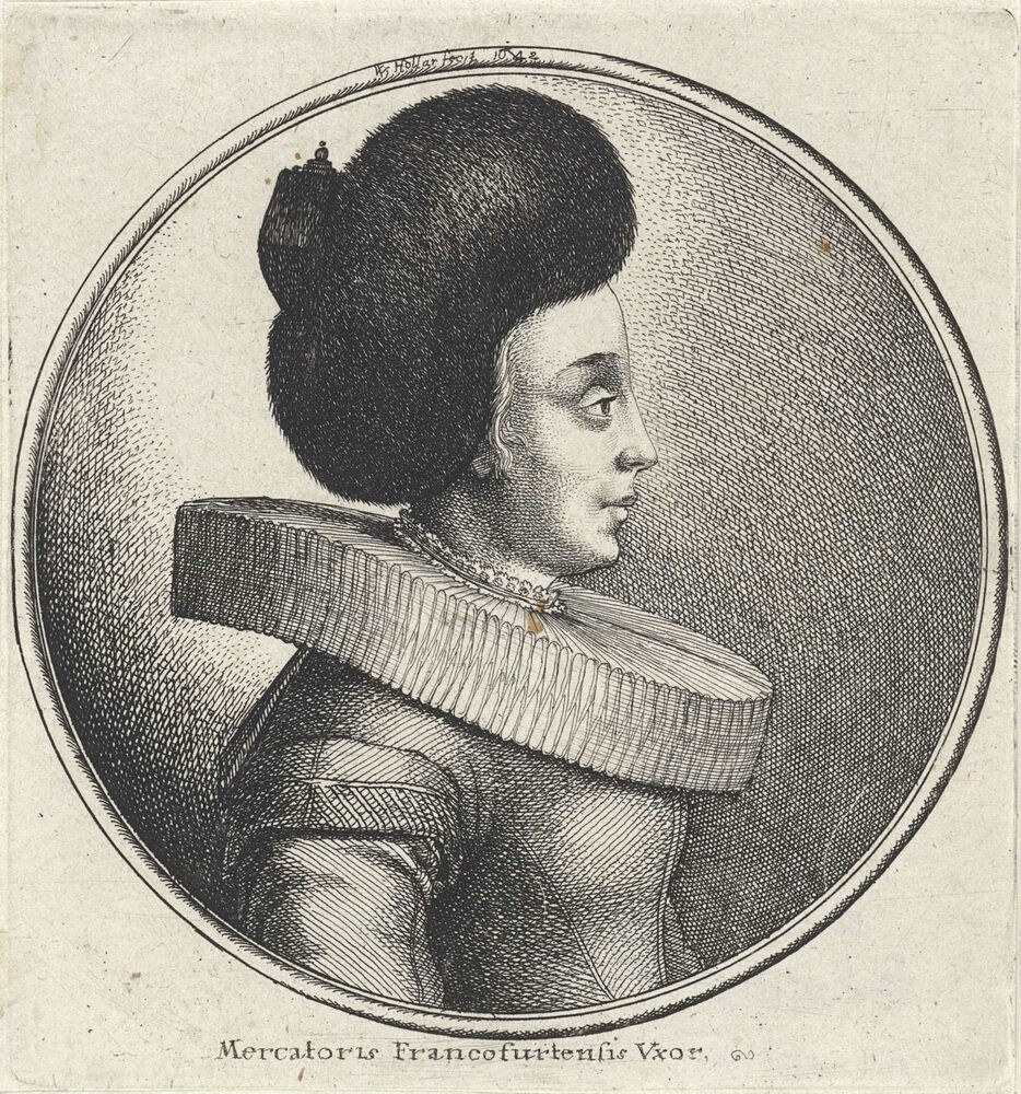 Vrouw met plooikraag en grote bontmuts, en profil