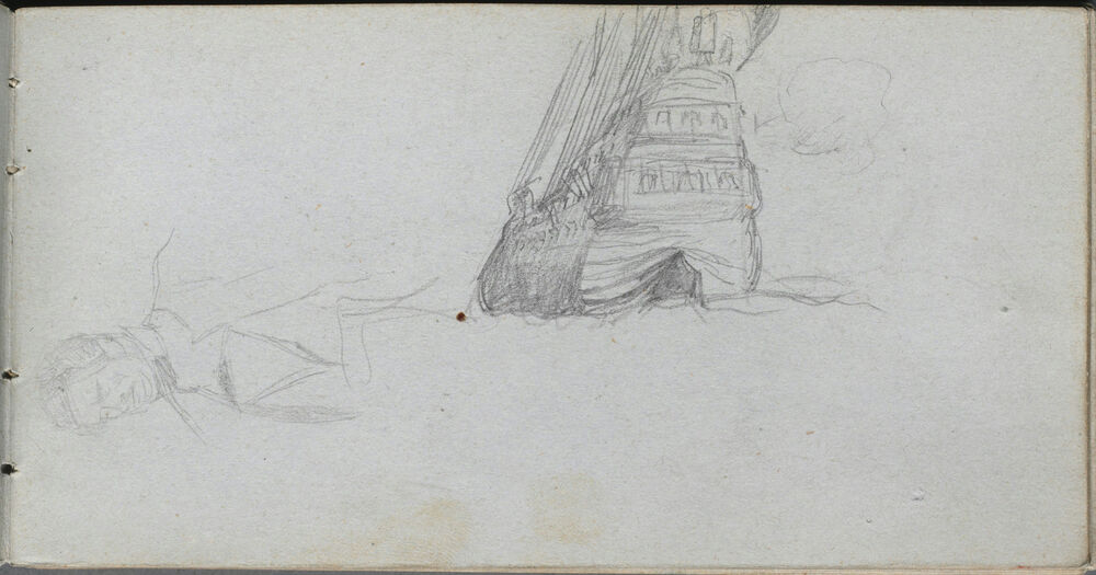 Sketchbook, page 84: Figure Study, Study of a Ship