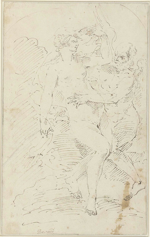 Gevleugelde grijsaard omvat naakte jonge vrouw