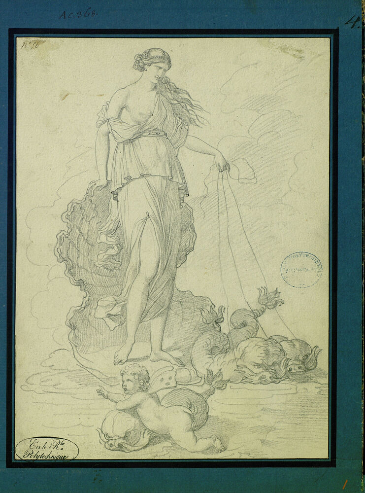Venus' chariot: Venus on a shell-shaped chariot pulled by two dolphins