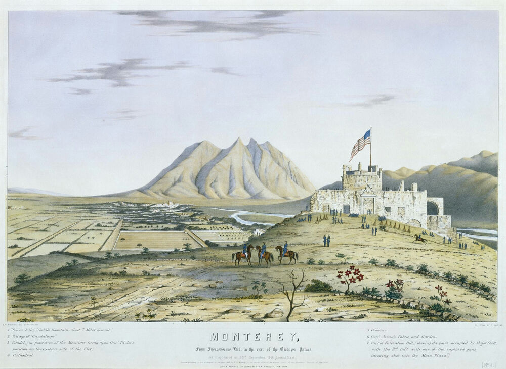 Monterey, From Independence Hill, in the rear of the Bishop's Palace. As it appeared on 23rd September, 1846 [Looking East.]... [No. 4] [with the village of Guadaloupe and Sierra Silla, or Saddle Mountain, in the distance.]