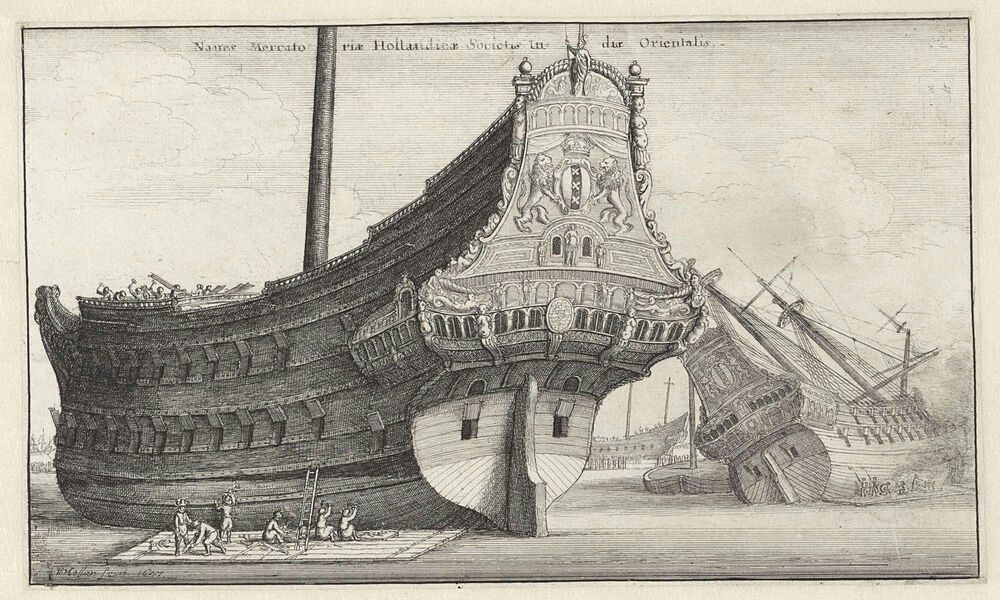 Werkzaamheden aan de rompen van twee Nederlandse Oost-Indiëvaarders