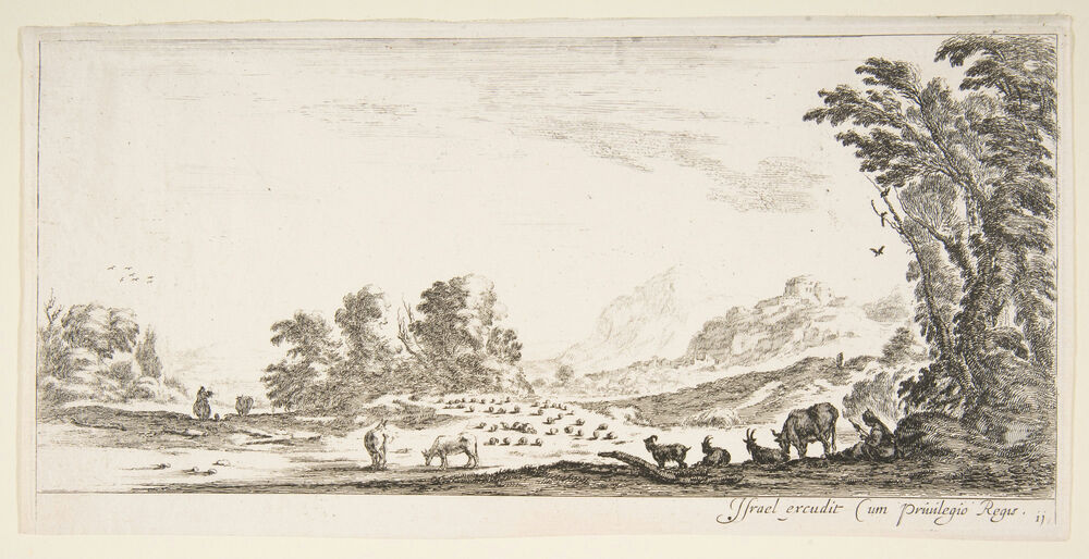 Plate 11: shepherdess seated to the right under a tree, watching her flock to the left, mountains to right in the background, from 'Various landscapes' (Divers paysages)