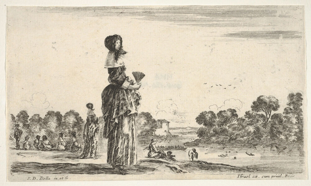 A lady standing in center holding a fan watching the bathers in the river to right, other ladies and men watching bathers to left in the background, from 'Various figures and lands' (Diverse figure e paesi)