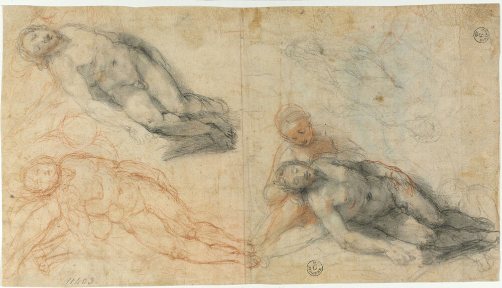 Three Studies of One Figure Supporting Another and Figure Sketch (for “Lamentation”, Bologna, Palazzo D’Accursio)
