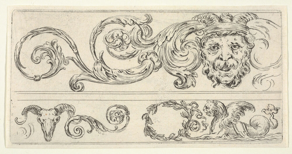 Plate 2: three fragments of friezes; on top, a grotesque head of a man, a skull of a ram at bottom left and a chimera at bottom right, from 'Friezes, foliage, and grotesques' (Frises, feuillages et grotesques)