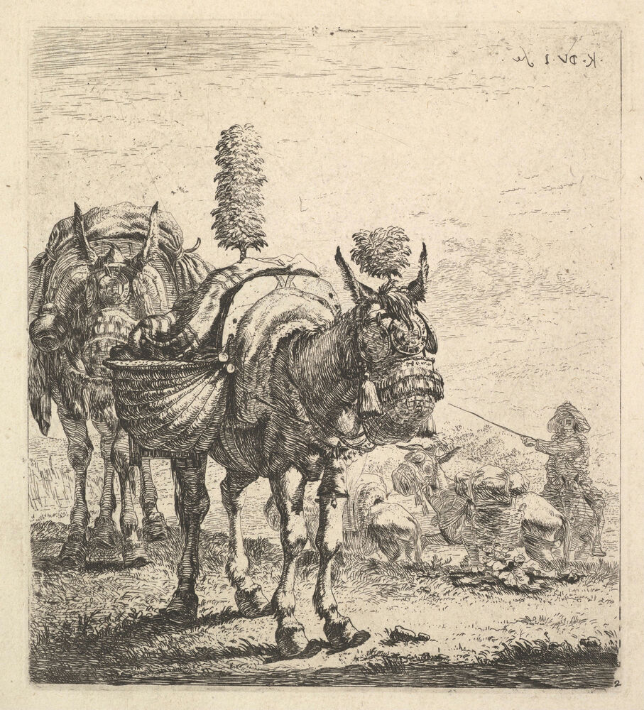 Two mules bearing panniers and outfitted with blinders, plumes, and tassels; one mule in three-quarter view and behind it a mule in frontal view; beyond a man mounted on a horse directs mules with a rod