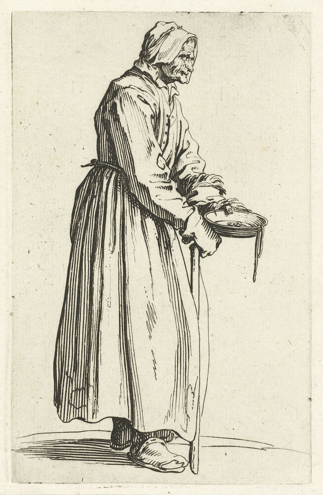 Bedelares met een centenbakje en een stok