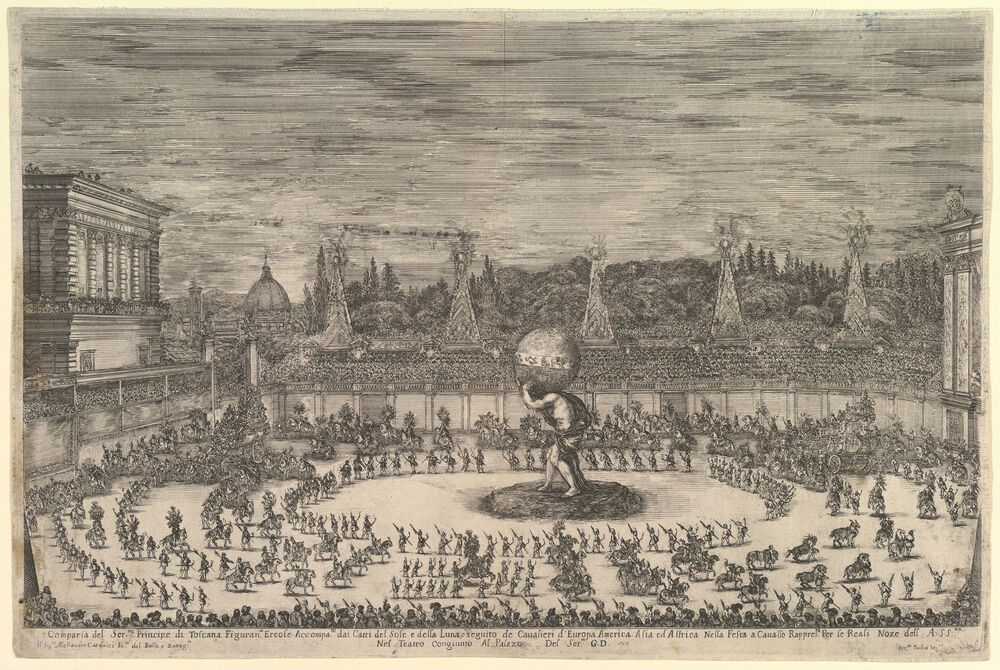 Entry of the prince of Tuscany as Hercules, in front of him a large procession of horsemen and footsoldiers, processing around the large statue of Atlas in center, the Duomo and the Pitti Palace to left in the background, spectators surrounding from all sides, from 'Il mondo festeggiante'