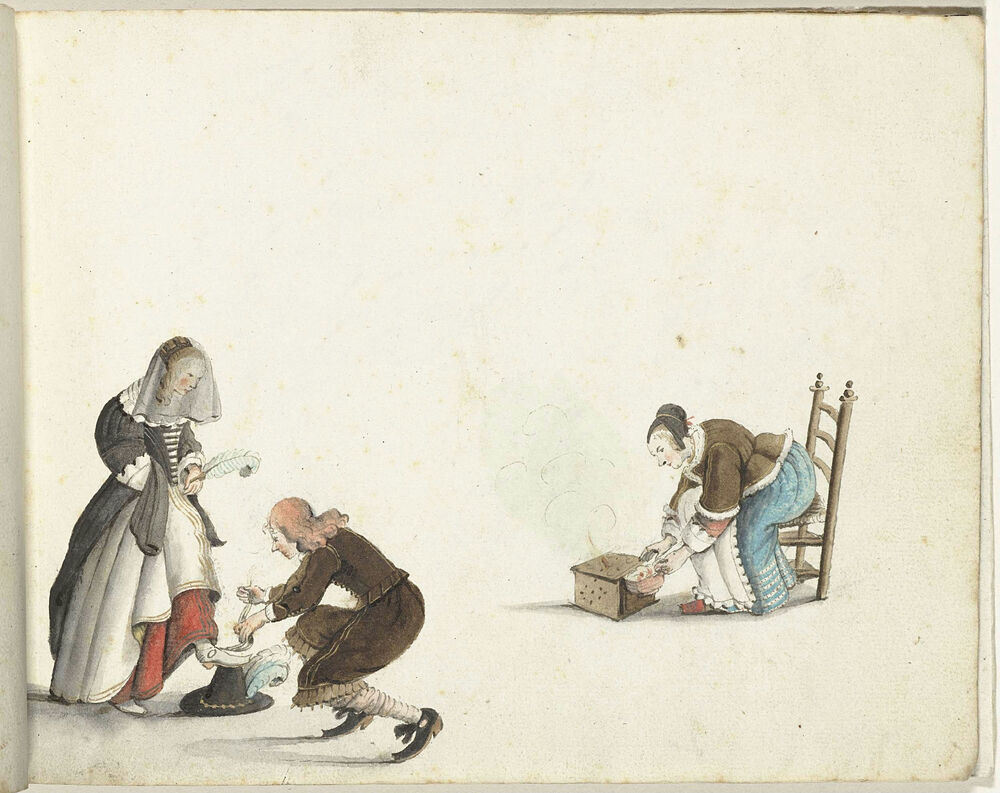 Heer strikt de schoen van een dame en een vrouw doet vuur in een stoof