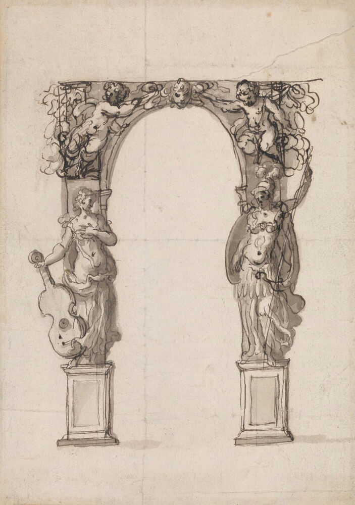 Design for a Temporary Arch Ornamented with Putti and Allegorical Figures of Music and War