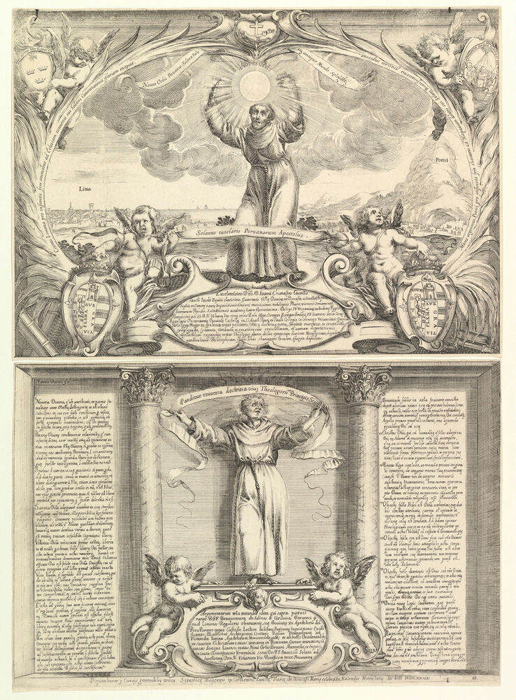 Decoration for a Thesis in Honor of Saint Francis Solano in two parts: the top part with Saint Francis Solano with his arms raised and a sun in his hands with Mount Potosí at right, the lower part with the doctor of the church holding a banner and two putti below