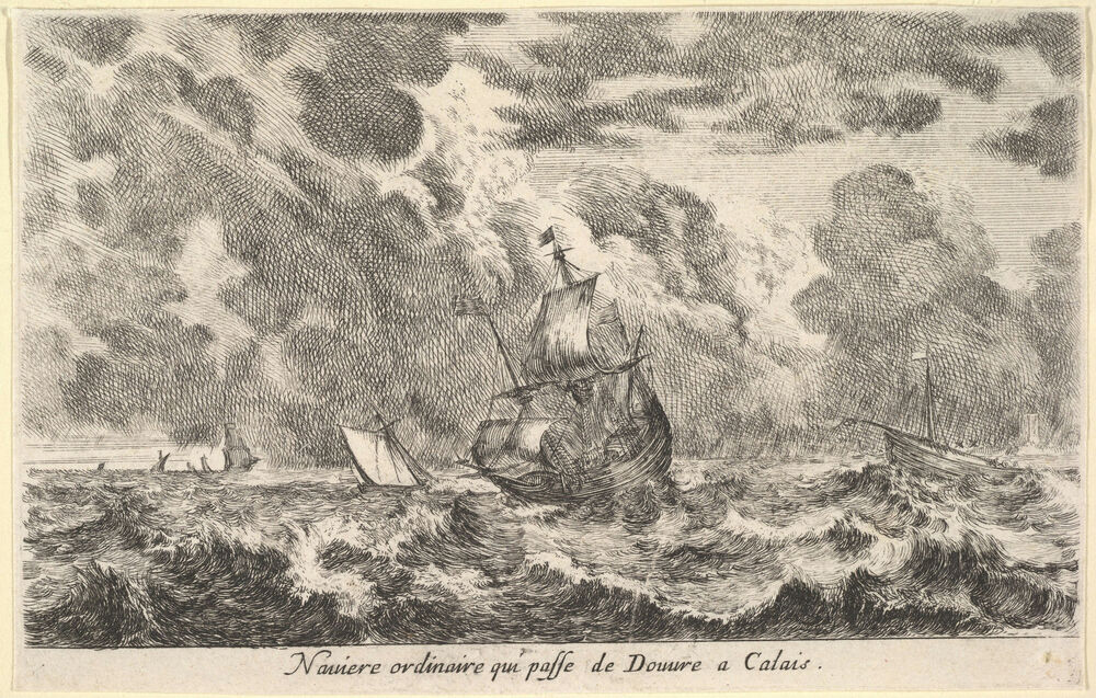 An ordinary ship travelling between Douvre and Calais (Naviere ordinaire qui passe de Douvre a Calais), ship in the sea at center, other boats to left and right, a ship to left in the background, from 'Views of seaports' (Vues de ports de mar)