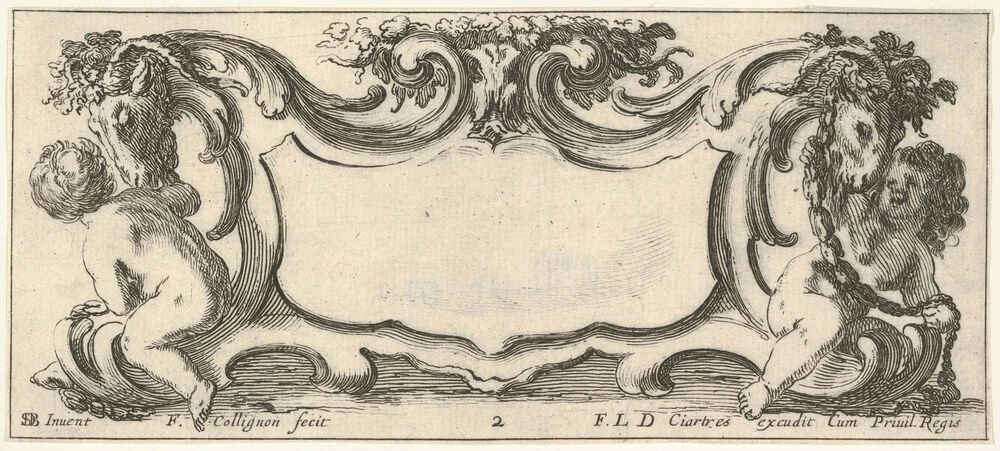 Plate 2: a cartouche with a child seen from the back to left and a child seen from the front to right, each playing with the head of a sheep crowned with flowers, from 'Twelve cartouches' (Recueil de douze cartouches)