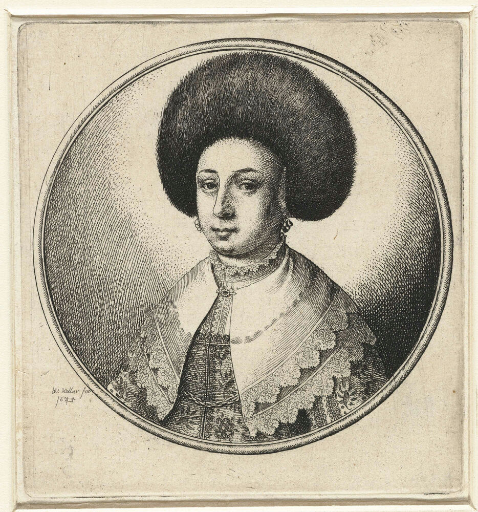 Vrouw met kanten kraag, oorbellen en bontmuts