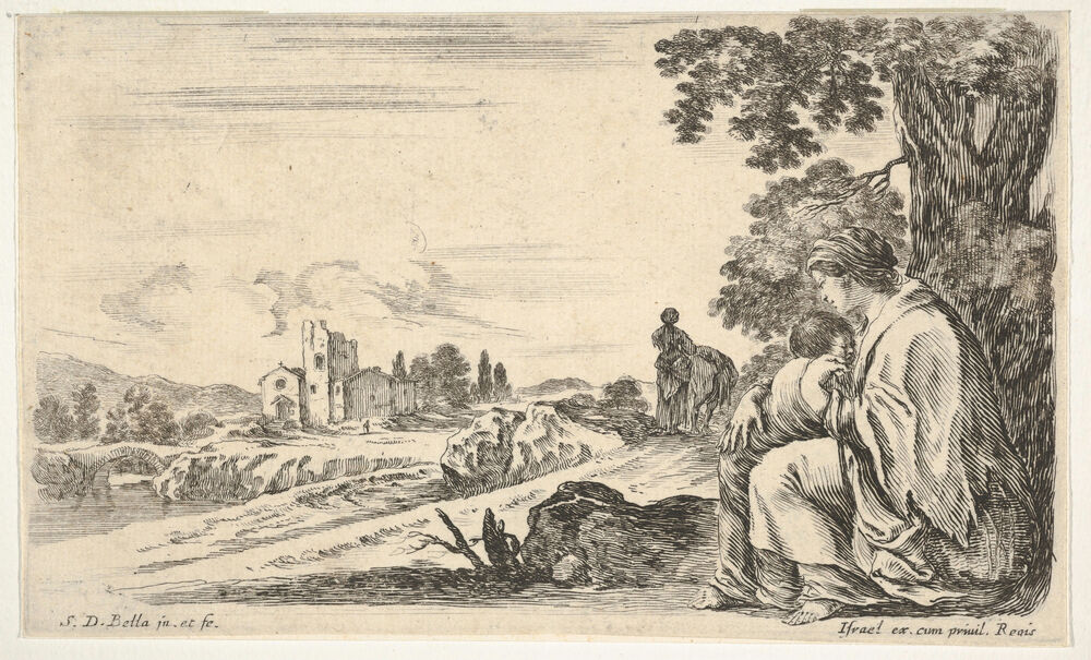 A peasant woman facing left in profile nurses a baby under a tree at right, a woman, seen from behind, walking next to a donkey in the middle ground, a church and bridge to left in background, from 'Various figures and lands' (Diverse figure e paesi)