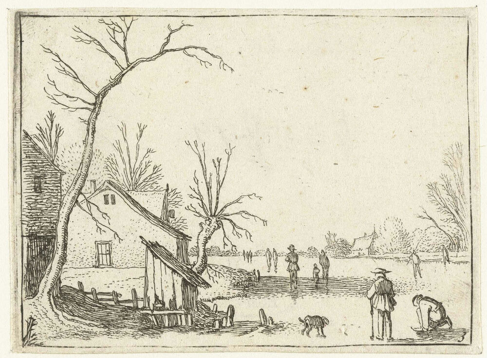 Boerderij bij bevroren rivier en schaatsers op het ijs