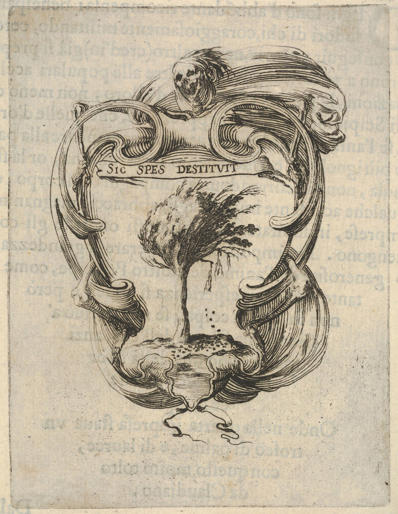 A cartouche with a tree blowing in the wind, a skull with drapery at top, bones to either side, from 'Eight Emblems for the Funeral of Francesco de Medici' (Huit emblèmes pour les funérailles du prince François de Médicis)
