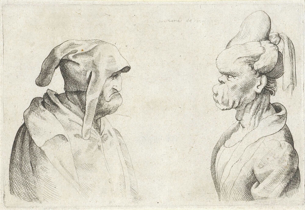 Misvormde koppen van een man met slappe muts en vrouw met opgebonden haar
